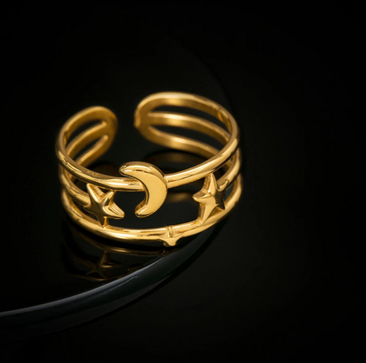 Anti-Tarnish Celestial Gold Ring – Adjustable Moon & Stars Design