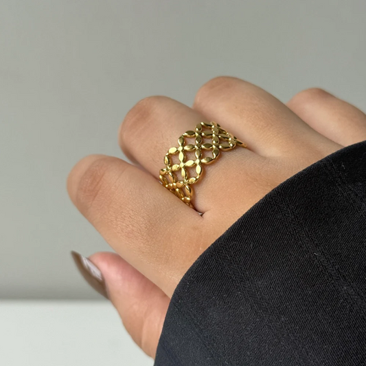 Anti-Tarnish Gold Lattice Statement Ring – Adjustable Openwork Design