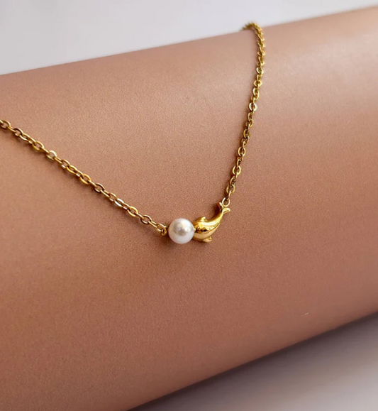 Gold-Plated Dolphin Pearl Pendant Necklace for Women | Stainless Steel Chain