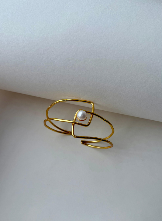 Elegant Adjustable Brass Bangle with Pearl Accent – Handmade Geometric Gold Cuff Bracelet