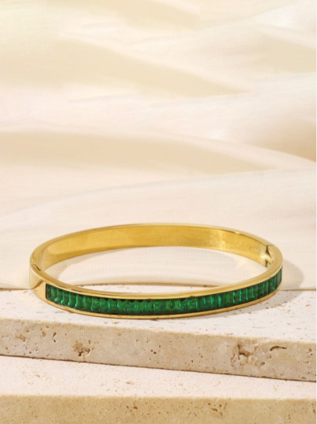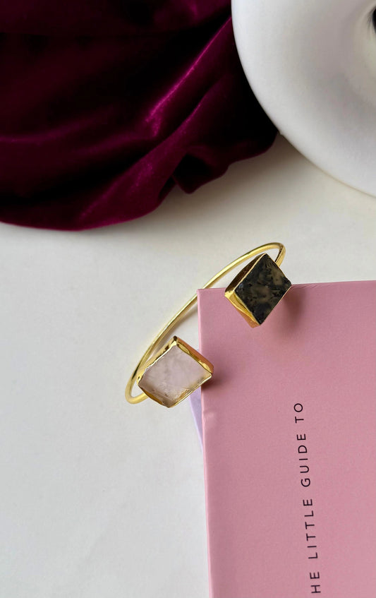 Dual Tone Stone Open Cuff Bracelet – Golden Brass Bangle with white & Green Stones