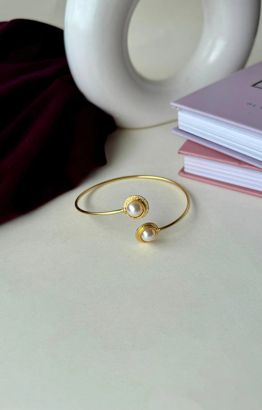 Gold Open Bangle Bracelet with Dual Pearl Accents | Brass Anti-Tarnish Adjustable Cuff