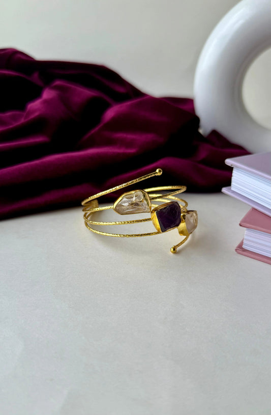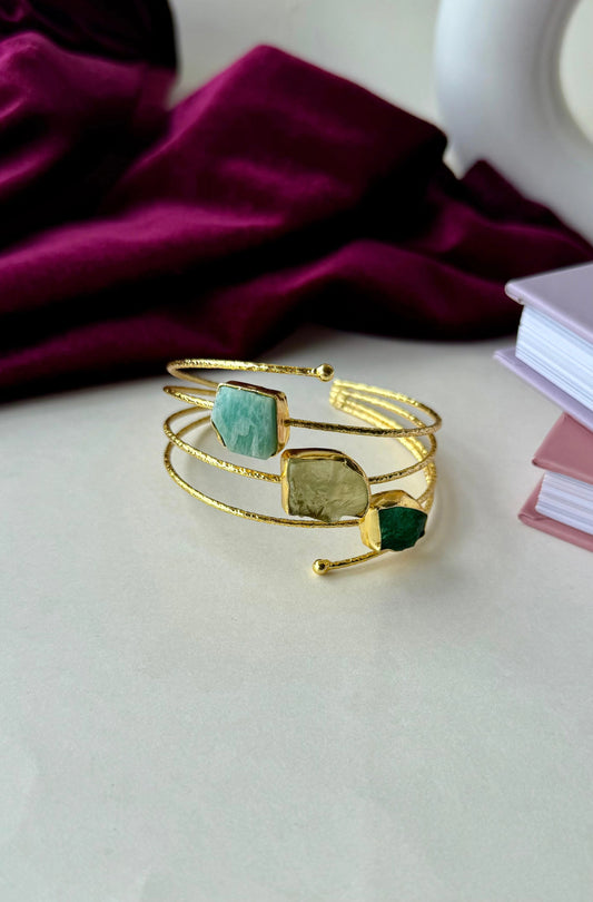 Gold-Plated Brass Cuff Bracelet with Raw Gemstones | Adjustable Anti-Tarnish Spiral Bangle