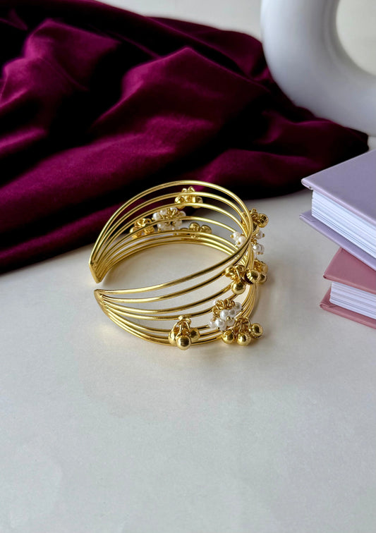 Gold-Plated Brass Cuff Bracelet with Pearl Cluster & Ghungroo Charms | Adjustable Anti-Tarnish