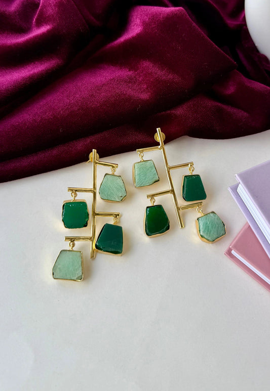 Statement Geometric Drop Earrings | Green Stone Brass Earrings | Anti-Tarnish Gold Finish Dangle Jewelry