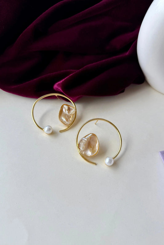 Gold Open Hoop Earrings with Pearl & Shell Accent | Brass Anti-Tarnish Modern Earrings