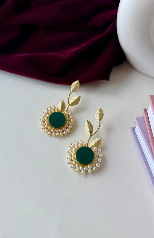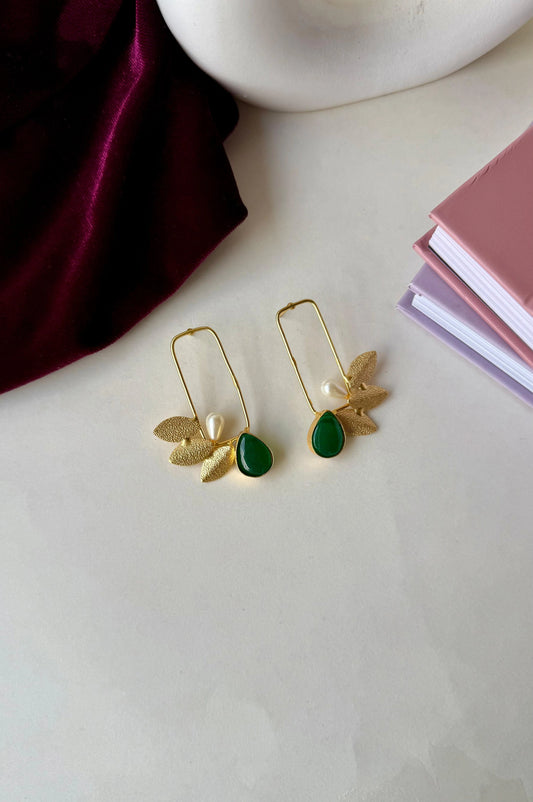 Green Stone & Pearl Leaf Earrings – Golden Brass Dangle Earrings