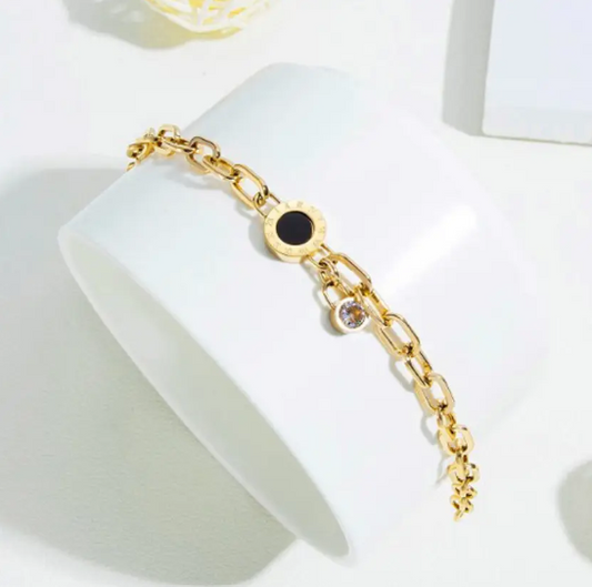 Gold Chain Bracelet with Black Enamel & Crystal Charm | Stainless Steel Anti-Tarnish Adjustable Jewelry