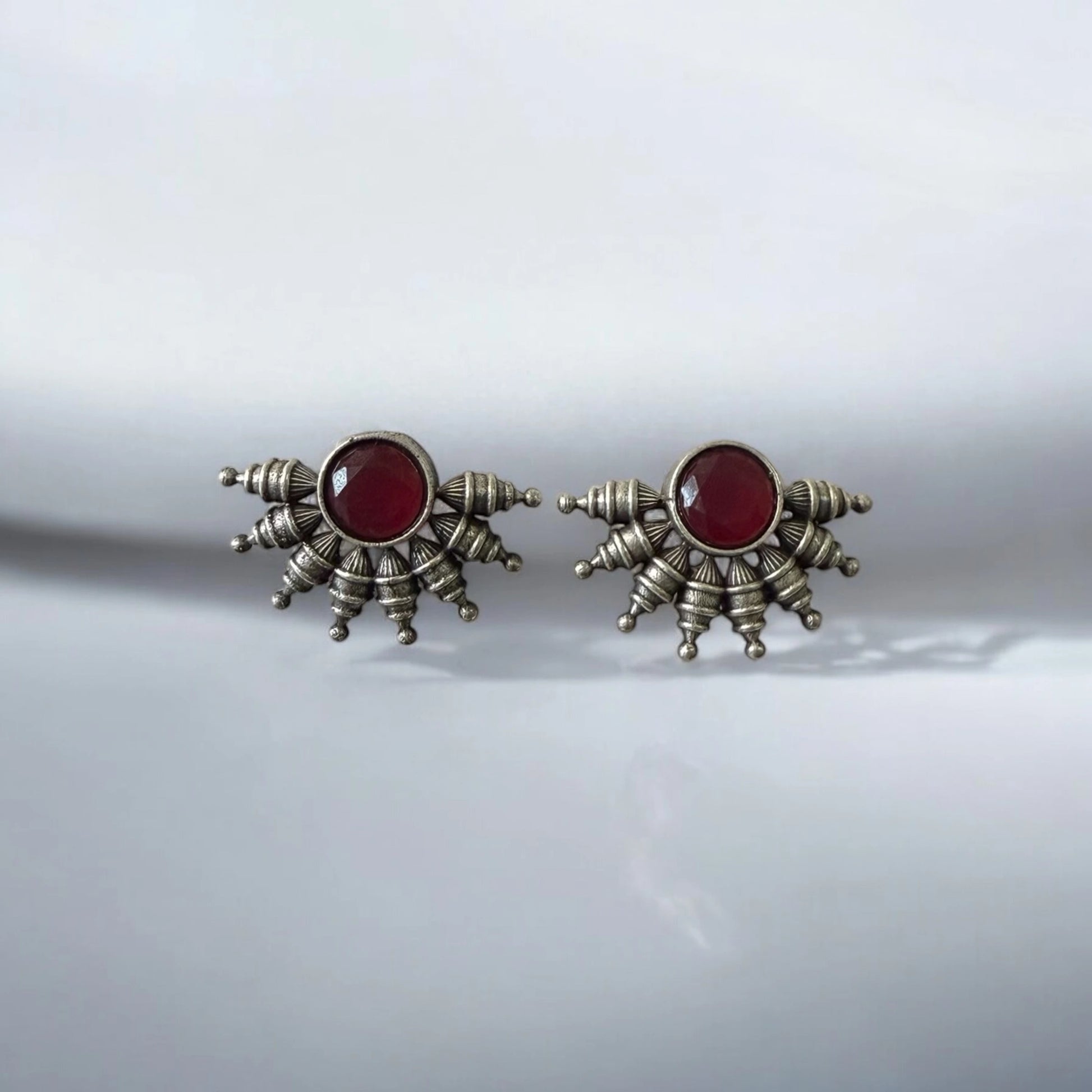 Antique Red Stud Earrings with Intricate Silver Detailing