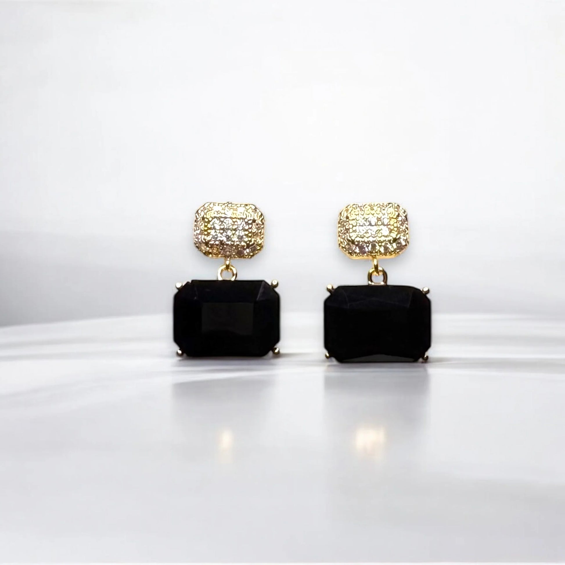 black and gold earrings, crystal drop earrings, black gemstone earrings, rectangular gemstone earrings, elegant evening jewelry, statement earrings, formal accessories, black and gold dangle earrings, glamorous jewelry, fashion jewelry