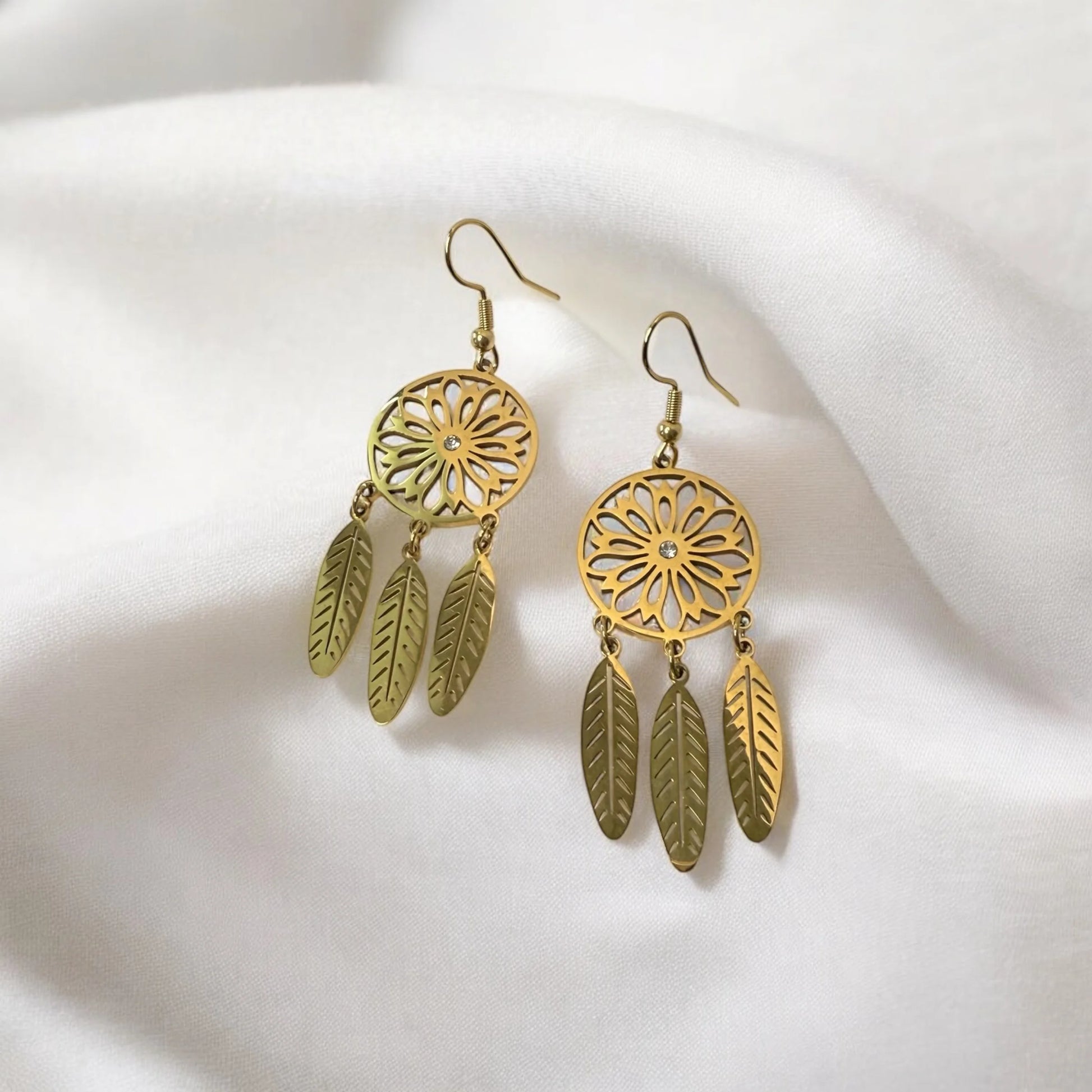 Embrace timeless elegance with these beautifully crafted gold dreamcatcher-inspired dangle earrings. Designed for those who love a touch of bohemian style, these earrings feature an intricate floral mandala pattern at the top, adorned with a delicate rhinestone centerpiece. Three feather charms dangle gracefully below, adding movement and charm to each piece. Made from high-quality, lightweight materials, these earrings are comfortable to wear all day, perfect for elevating both casual and formal looks. They make a thoughtful gift for birthdays, anniversaries, or any occasion where you want to share a bit of elegance and positivity.
