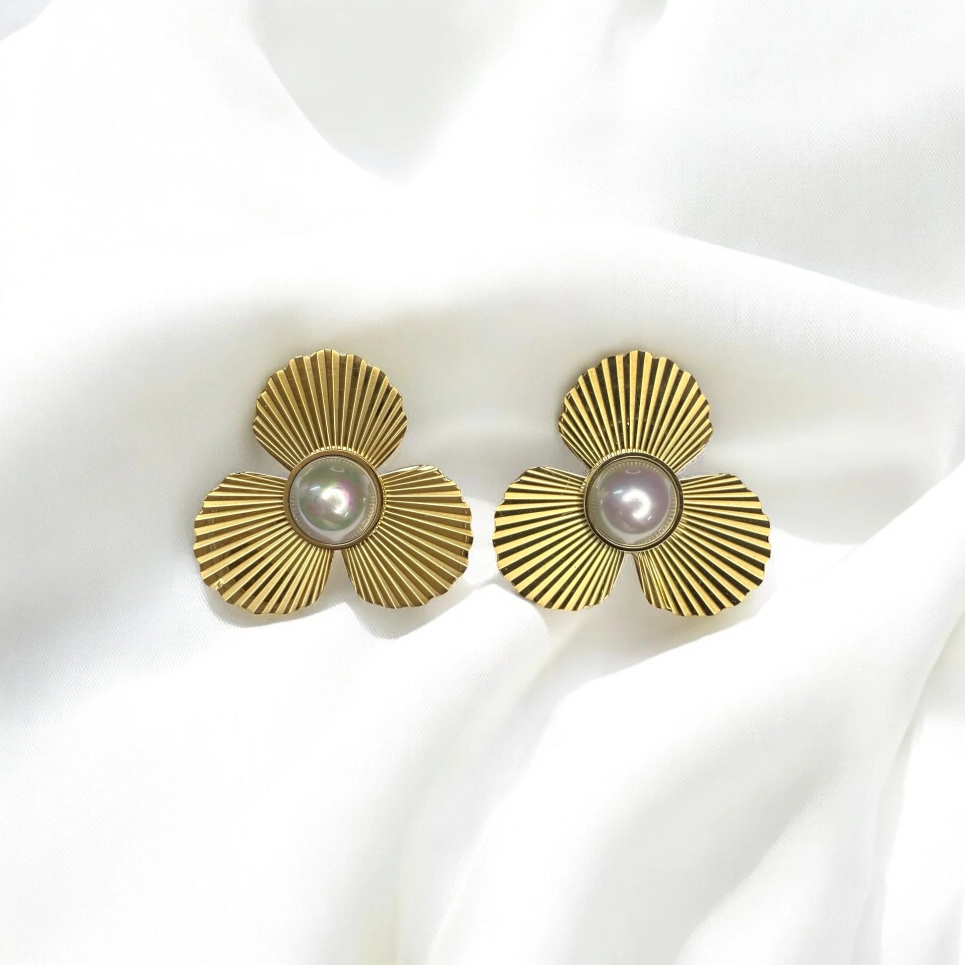 Add a touch of elegance to your jewelry collection with these exquisite gold floral stud earrings. Featuring a unique three-petal flower design, these earrings are crafted with radiant gold tones that beautifully complement any outfit. The centerpiece is a lustrous pearl, adding a classic charm to the contemporary floral motif. Perfect for both casual and formal occasions, these lightweight and comfortable studs will elevate your look effortlessly. Ideal for fashion-forward women, these earrings are a must-have accessory, offering timeless beauty and sophistication.