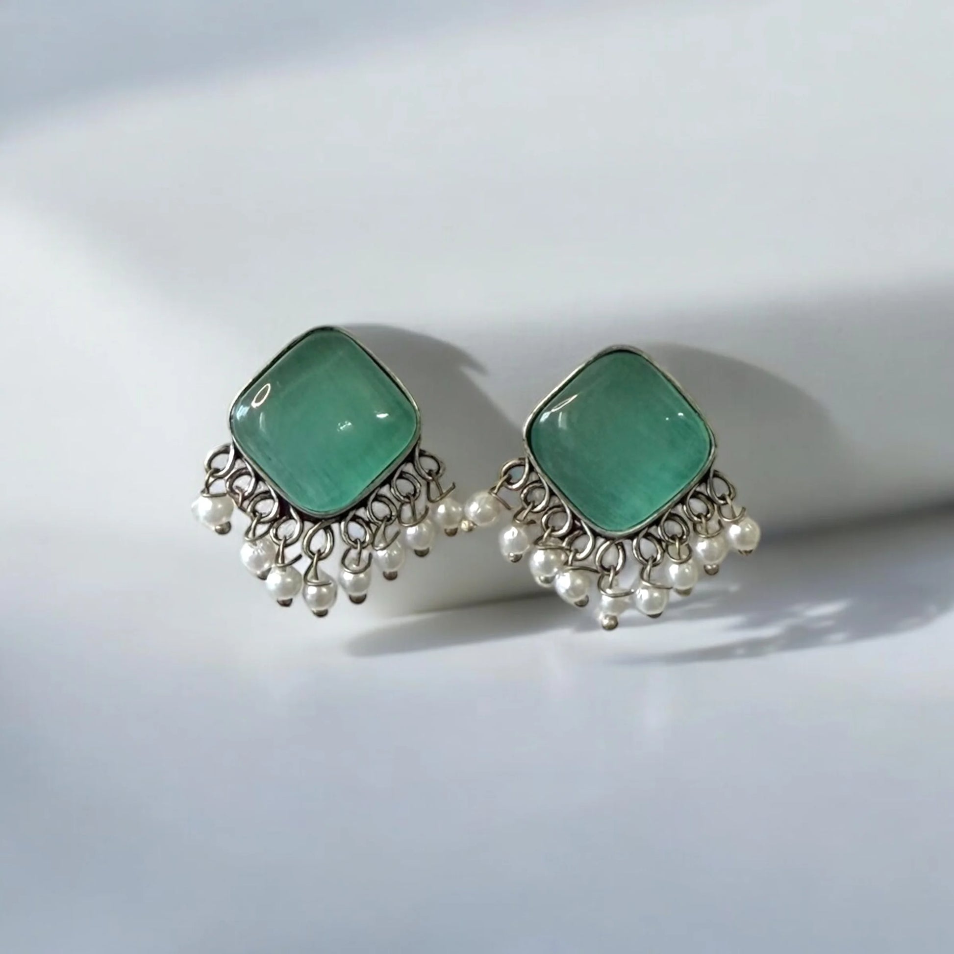 Elevate your jewelry collection with these stunning green stud earrings that blend modern sophistication with traditional charm. Featuring a unique square-shaped green stone and delicate pearl danglers, these earrings are designed to turn heads and complement any outfit effortlessly.