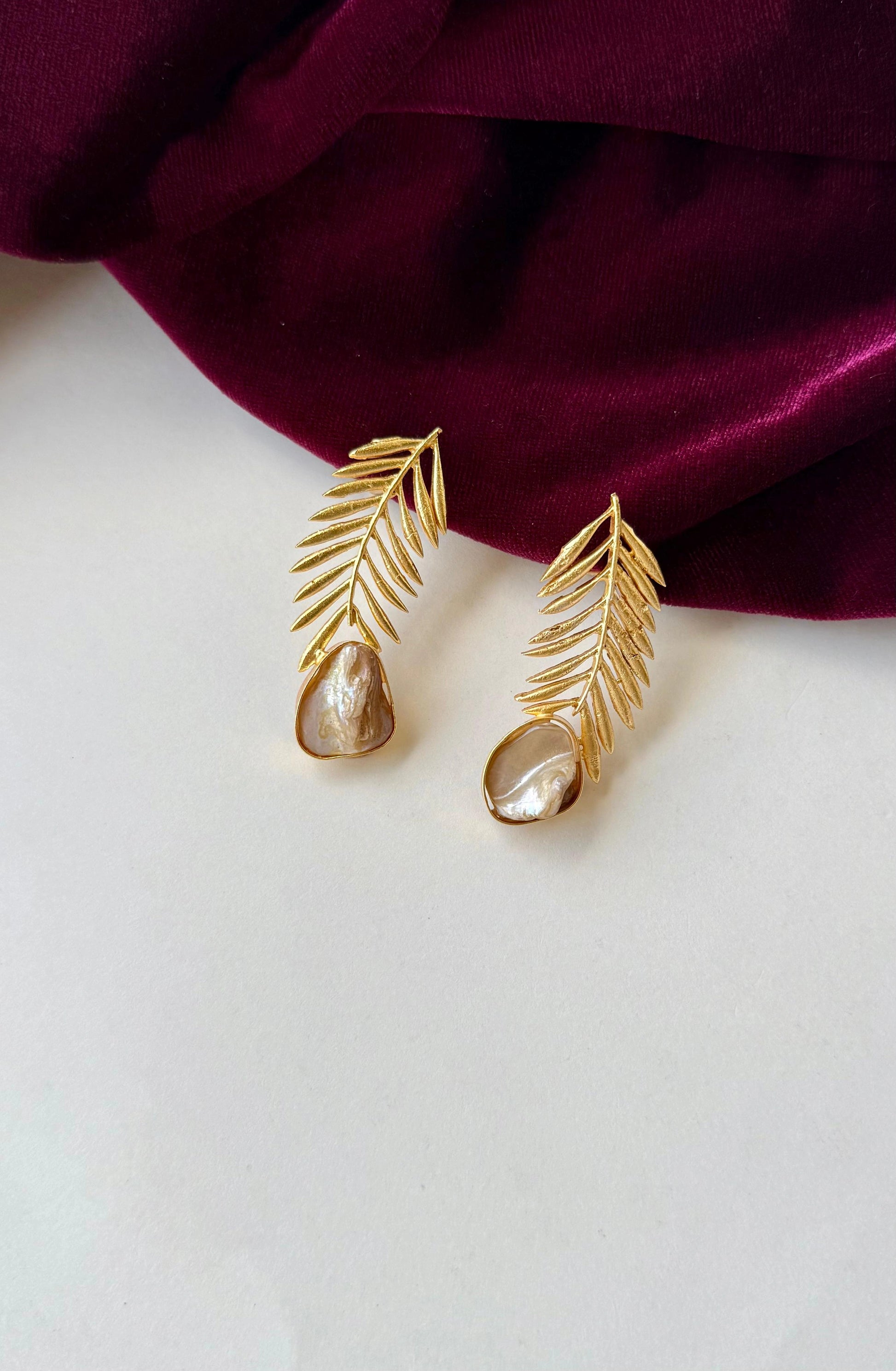 Add a touch of nature-inspired luxury to your look with these handcrafted botanical leaf earrings. Expertly made from anti-tarnish brass and finished with radiant gold plating, each earring features a detailed palm leaf design cascading into a luminous baroque-style pearl drop. Lightweight yet statement-worthy, these earrings are perfect for brunches, evening events, festive occasions, or gifting. A beautiful fusion of earthy elegance and artisanal charm.