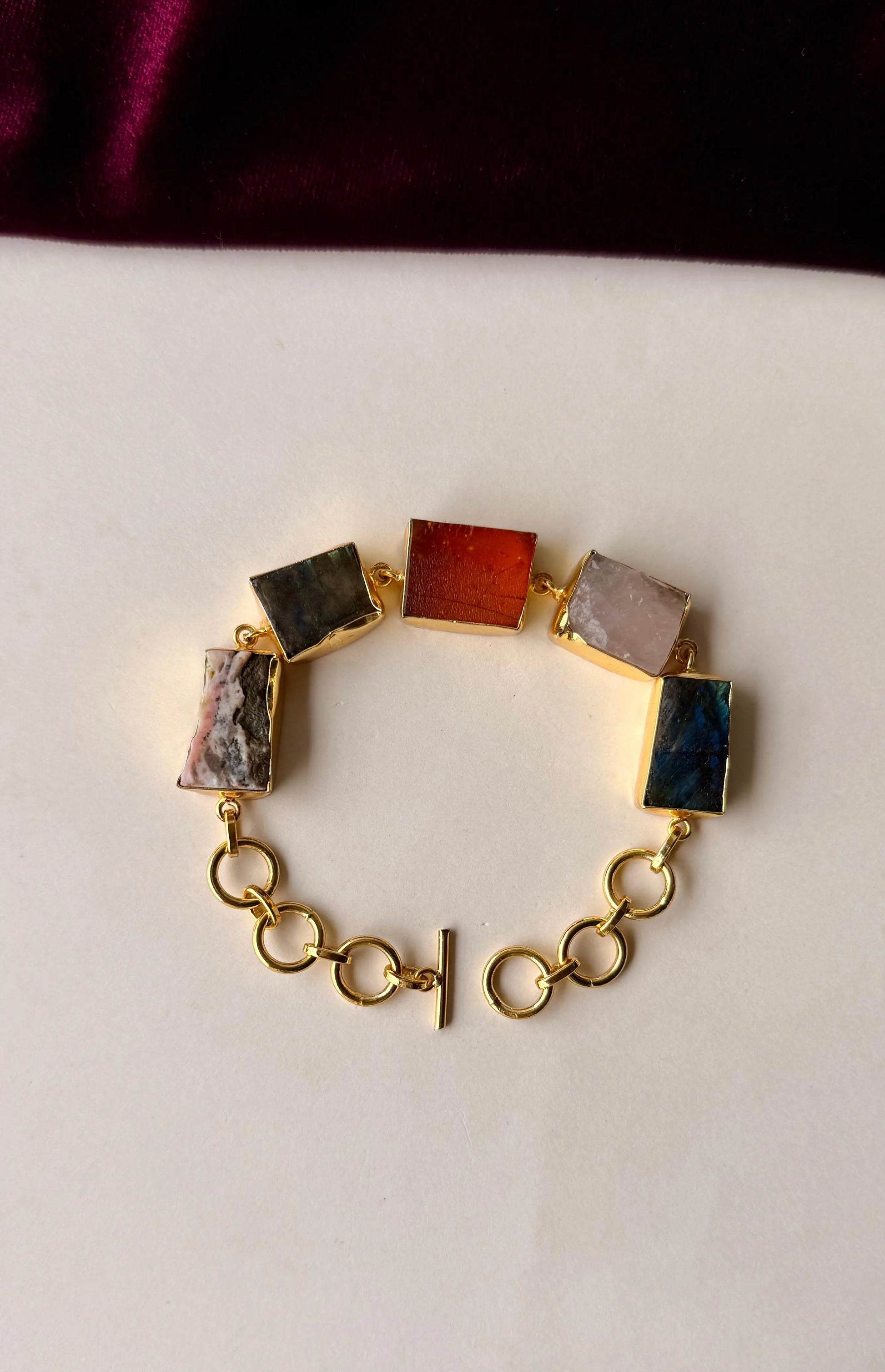 Elevate your style with this exquisite handcrafted bracelet featuring raw, natural gemstones set in high-quality gold-plated brass. Each bracelet is a one-of-a-kind piece that blends earthy elegance with bold contemporary charm. Designed for lovers of unique, artisanal jewelry, this statement accessory is perfect for both everyday wear and special occasions. With an adjustable clasp and vibrant stone colors, it's a must-have addition to your boho-chic jewelry collection.