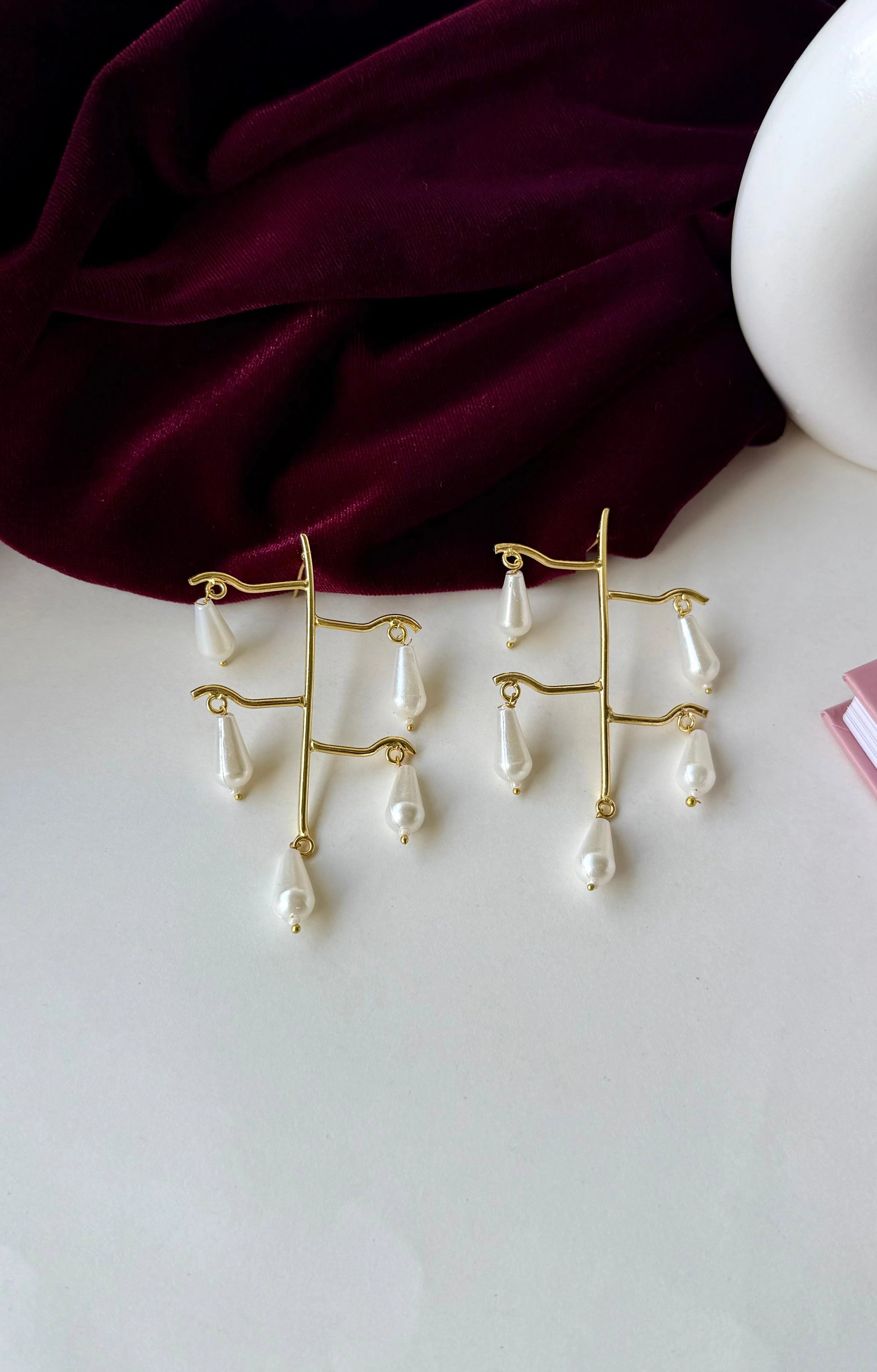 Elevate your accessory game with these uniquely modern pearl drop earrings. Designed in an abstract grid silhouette, each earring features delicate teardrop pearls suspended from anti-tarnish matte gold brass. The asymmetric lines and kinetic movement add a bold, contemporary twist to traditional pearl jewelry. Lightweight yet eye-catching, these earrings are perfect for day-to-night transitions, festive dressing, or artful styling.