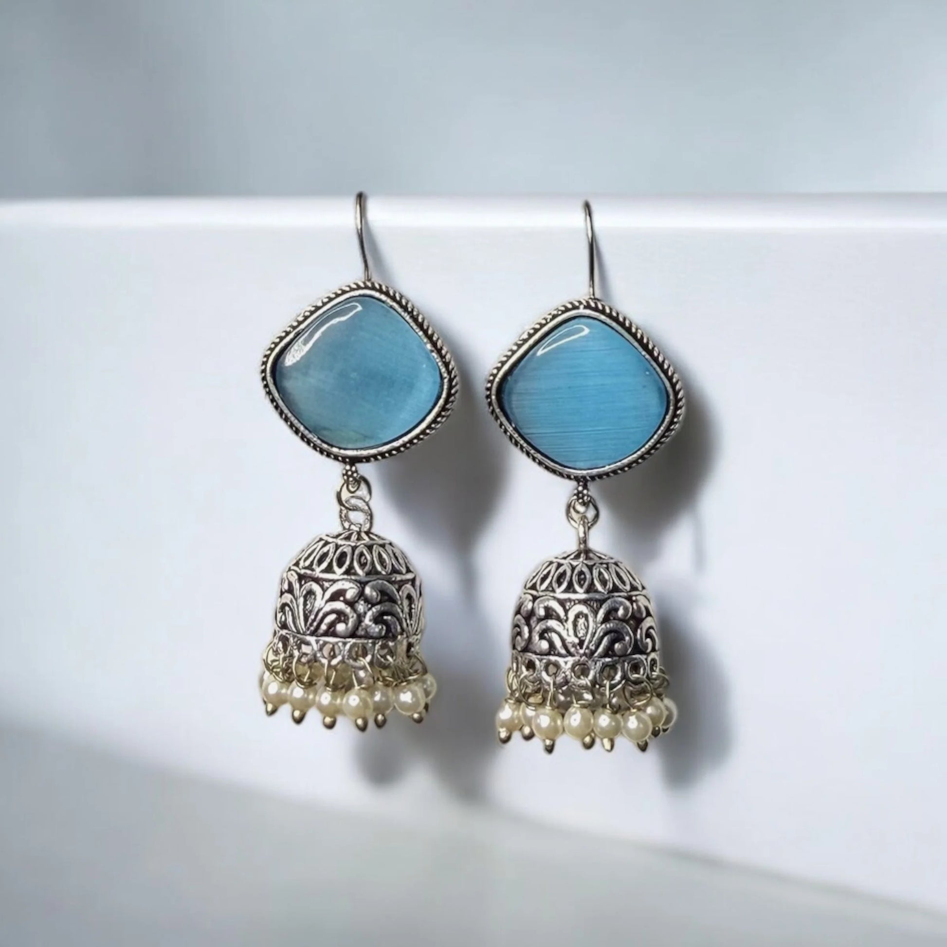 Silver-Plated Jhumka Earrings with Blue Stone Top and Pearl Danglers – Elegant Ethnic Jewelry
