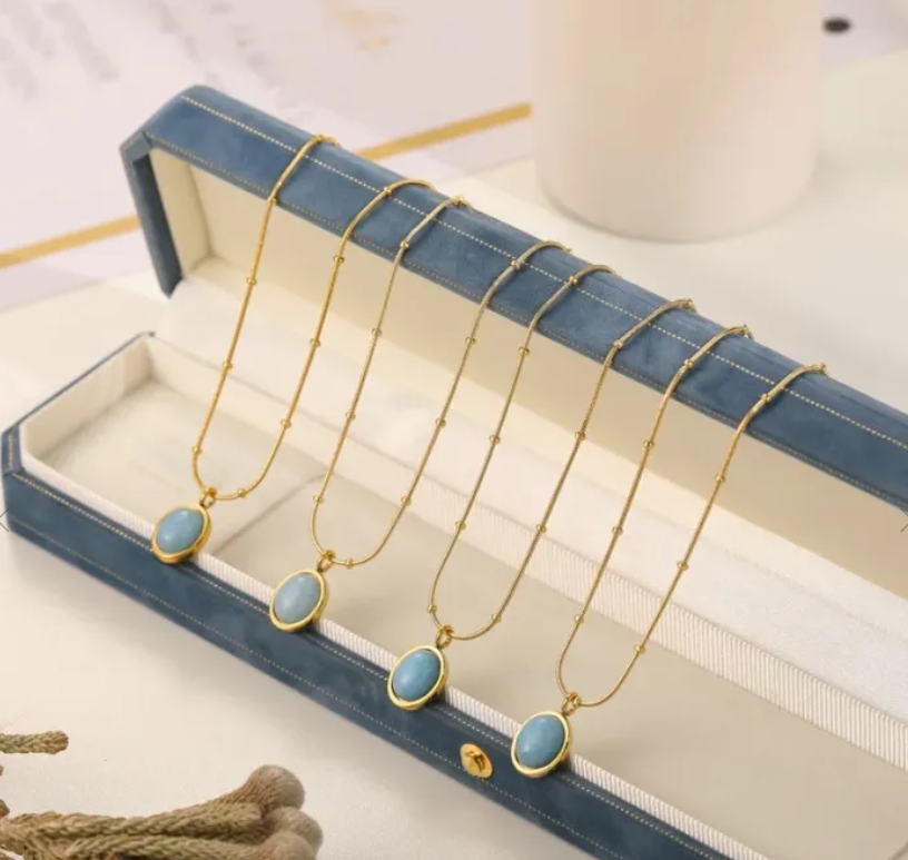 Discover timeless elegance with our Gold Necklace featuring a captivating Green Gemstone Pendant. This luxurious piece boasts a high-quality gold-plated chain adorned with delicate beaded accents, enhancing its sophisticated appeal. The pendant showcases a polished, oval-shaped green gemstone framed in a sleek golden setting, perfect for adding a touch of sophistication to any outfit.